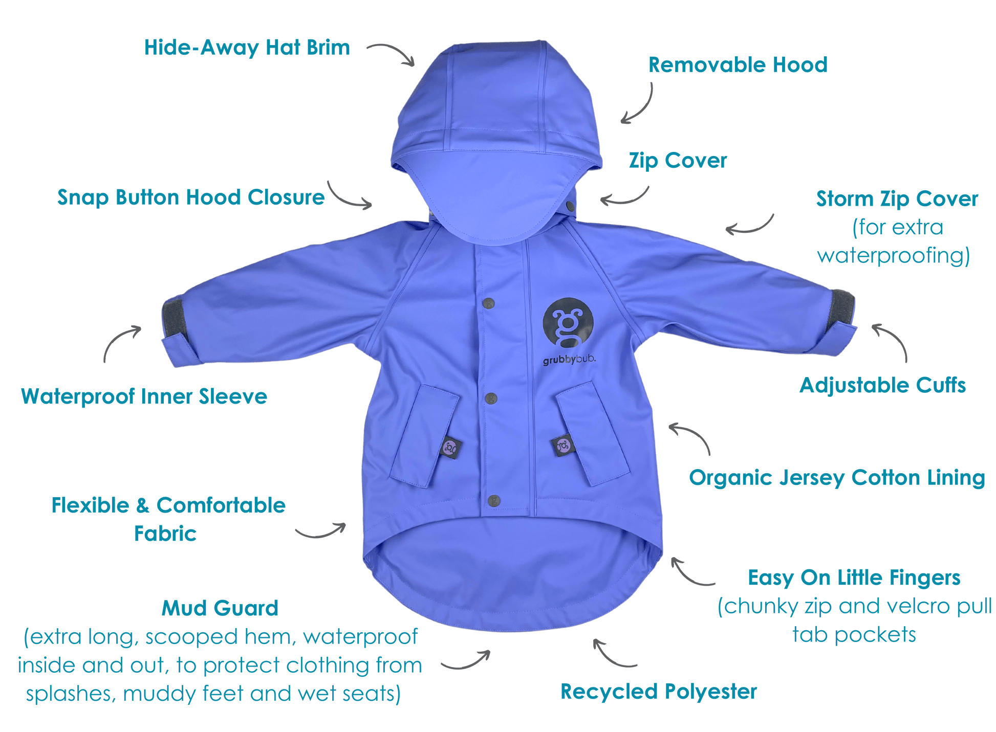 Made breathable with separate layers of waterproof recycled polyester and organic jersey cotton, our jackets are jam-packed with design features that make playing and caring for it as easy as splashing in a puddle.